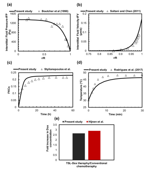 TSL-Dox delivery is of great importance in targeted drug delivery systems for tumor treatment. Since measuring concentrations in preclinical in vivo studies is very difficult, adequate experimental results are not available to validate the mathematical models. Therefore, we established qualitative verifications of TSL-Dox delivery via an in vivo study of Hijnen et al. [68]. Figure 2e compares the fold increase in DOX concentration between the present study and that in the literature. The fold increase in DOX concentration in our approach is 6% less than that in the approach of Hijnen et al. The difference in the fold increase in DOX concentration comes from the experimental approach versus the computational approach, which is marginal. It is also worth mentioning that the equations, parameters, and assumptions considered in this study have been confirmed in previous studies [69,70,71,72,73,74].