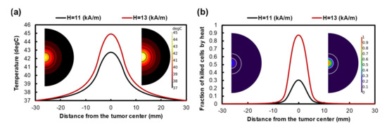 Using a higher magnetic field amplitude can improve the heat generated by MNPs. Figure 4a,b indicate that increasing the magnetic field amplitude to 13 kA/m can improve the temperature level inside the tumor; therefore, 80% of cancer cells are killed at the tumor center. However, the temperature does not increase in the tumor regions adjacent to the injection site. Although using a high magnetic field eliminates most of the cancer cells at the injection site, the majority of the other parts of the tumor remain untreated. Increasing the magnetic field intensity did not cause the temperature gradient to expand in the tumor, so the effectiveness of the heat generated by MNPs was mainly restricted to their injection site in both high and low magnetic fields.