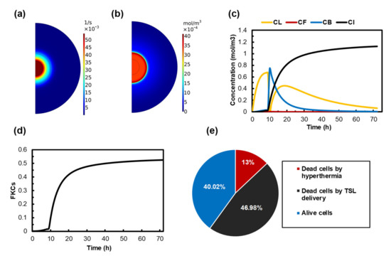 Liposomes represent a versatile system for combination treatment strategies, which emerged as a potential solution to conventional chemotherapy problems because they can release their contents into the ROI [87]. Local hyperthermia has become the most widely used stimulus for the triggered release of liposomal drugs, providing a targeted control of drug release, which can enhance chemotherapeutic efficacy in many clinical settings [88]. In the current study, MHT is implemented as a stimulus for TSLs to release their cargo. It should be noted that the temperature in the vicinity of the injection site is not high enough to kill cancer cells, but it can increase the drug release rate from TSLs. As a result, the drug spreads to the area of the tumor that was not exposed to high temperatures. This result is obtained by comparing Figure 5a with Figure 5b. Figure 5b demonstrates that the drug spreads outside of the injection site, covering nearly an entire 1 cm tumor after MHT. Figure 5c indicates the final outcomes of the TSL-Dox delivery induced by MHT. A high intracellular concentration reveals the ability of MHT to provide enough temperature distribution for TSLs to release their contents. It is worth mentioning that released drugs are dispersed in the tumor region (due to diffusion and convection mechanisms in Equation (11)). In summary, the central part of the tumor, which comprises 13% of the tumor, is eliminated by hyperthermia. Furthermore, 47% of the remaining cells are eradicated by TSL-Dox delivery, and 40% of the cancer cells remain alive. A precise comparison between Figure 3b and Figure 5c indicates that the efficacy of TSL-Dox alone is 15% higher than that of conventional chemotherapy, which is due to the higher half-life of TSLs in the blood circulatory system, as well as the constant drug release rate from TSLs. MHT not only eliminates tumor cells via heat but also creates effective drug delivery through TSL-Dox.
