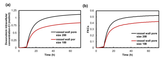 The wall of microvessels is a barrier against efficient drug transport, which is dependent on the drug type and on the structural characteristics of the vessel pore sizes that may vary depending on tumor type and location [77,78]. Therefore, vessel wall pore size plays a crucial role in drug delivery, especially in nanomedicine. To study how changes in vascular pore size distribution can affect the presented combination therapy, we studied the treatment outcomes of two sizes of vessel pores (100 nm and 200 nm). Figure 6a demonstrates the intracellular chemotherapy concentration released from TSLs as a function of time. The highest concentration was achieved for hyper-permeable tumors (i.e., a 200 nm vessel wall pore size). For a 100 nm vessel wall pore diameter, drug uptake by cancer cells is reduced to . This value is 34% lower compared to a tumor with a 200 nm vessel wall pore size. As a result, the TSL-Dox delivery system induced by MHT can be more efficient for tumors with larger vessel wall pore sizes due to greater permeability.