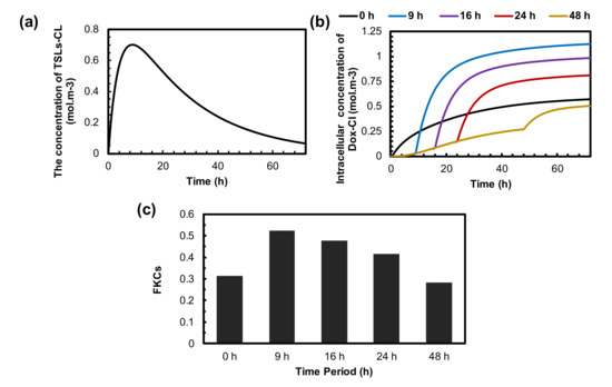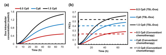 Thus far, we could integrate two parameters of the suggested combination therapy. Another important parameter is the dose of TSL-Dox. Figure 7a,b shows the Dox internalized concentration and FKCs with three different doses of TSL-Dox. The concentrations of the internalized drugs and FKCs for a certain dose of TSL-Dox () are and 0.53, respectively. With a 50% increase in injection dose, FKCs would be 0.63, increasing by 18%. The administration of a lower injected dose of TSL-Dox () causes the concentration of the internalized drug and FKCs to reduce to and 0.28, respectively. The effect of the initial dose on TSL delivery is the same as that of conventional chemotherapy. However, the efficacy of TSL delivery is higher with lower side effects. Increasing the injection dose from to has shown the same improvement in both combination treatment and conventional chemotherapy. FKCs increase by 0.08, although the efficacy of TSL delivery is higher with lower damage to healthy tissues.