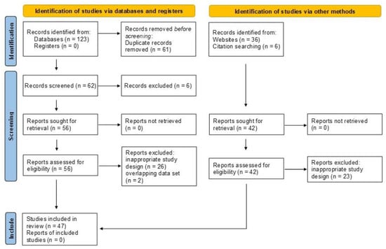A total of 123 bibliographic records were identified after electronic database searches, 36 through other sources and six through bibliographic record citation search. Among them, 61 records were removed as duplicates, leaving 104 titles and abstracts to be screened. After careful screening and manual search, six records were excluded based on title and abstract and 49 records due to inappropriate design and two records due to overlapping data sets with another record, resulting in 47 studies that were included in the quantitative synthesis [3,4,11,26,27,28,29,30,31,32,33,34,35,36,37,38,39,40,41,42,43,44,45,46,47,48,49,50,51,52,53,54,55,56,57,58,59,60,61,62,63,64,65,66,67,68,69] (Figure 1).