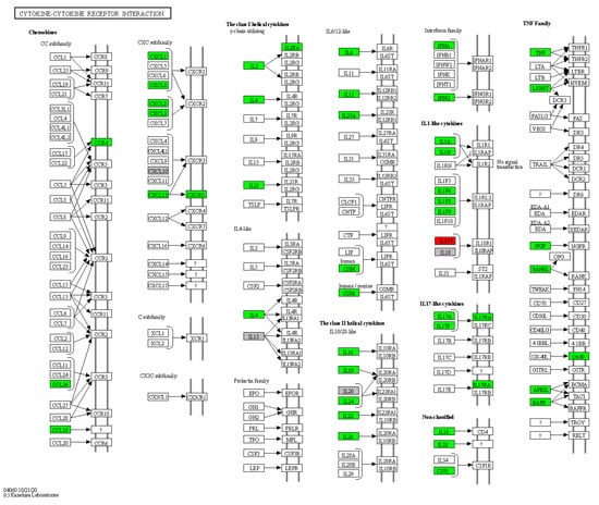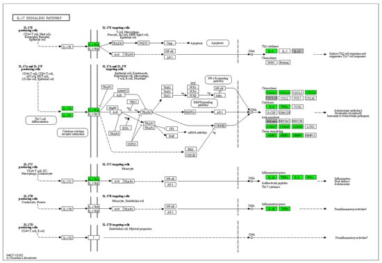 Furthermore, 45 HS biomarkers were enriched in the C–C receptor interaction pathway (5.6 × 10−43, Figure 2, 19 in the IL-17 signaling pathway (8.8 × 10−19, Figure 3), 19 in the JAK-STAT signaling pathway (6.0 × 10−14, Figure 4), 18 in the inflammatory bowel disease pathway (1.1 × 10−20), 18 in the rheumatoid arthritis pathway (1.2 × 10−17), 13 in the Th17 cell differentiation pathway (1.5 × 10−9), 13 in the lipid and atherosclerosis pathway (1.2 × 10−5), 10 in the TLR pathway (4.3 × 10−6), 9 in C-type leptin receptor signaling pathway (6.1 × 10−5), 8 in the tumor necrosis factor (TNF) signaling pathway (1.1 × 10−3) and 7 in the type I diabetes mellitus pathway (8.5 × 10−6) (Figure 5).