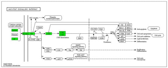 Hierarchical clustering of HS biomarkers in the KEGG GO JAK-STAT signaling pathway. Genes which are positively regulated in HS are shown in green color. Gray color corresponds to genes with a diversified reported regulation.