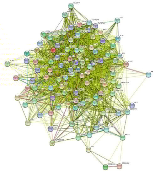 The protein-based connectivity map occurring from an assumed gene biomarker translation (103 proteins our of 109 genes) resulted in 2465 interactions compared with the expected 531 interactions (4.64-fold; p < 0.0001), a result that indicates a robust strong protein–protein association in HS (Figure 6). On the other hand, the protein-based connectivity map occurring from the 386 HS-associated DEGs (372 proteins out of 386 genes) resulted in 19,823 interactions compared with the expected 6502 interactions (3.05-fold; p < 0.0001), indicating that the biomarker selection procedure increased the HS/protein association.