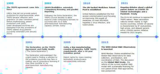 Timeline of global agreements and initiatives related to IP and access to medicines.