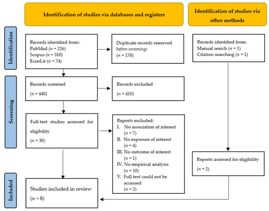 The literature databases PubMed (MEDLINE), Scopus, and EconLit were searched in October and December 2021 to identify relevant publications in English, without limits of date of publication or geographical settings. Additional gray literature and scholarly materials, including working papers, dissertations, and book sections, were manually searched using institutional websites, Google Scholar, and snowballing through review of references in the identified publications. Full information on MeSH terms, keywords, and Boolean operators used and search strategy developed for each database is provided in the Supplementary Materials (Table S1) to improve reproducibility of results [52]. All publications that reported results from an original quantitative or qualitative research study on the impact of voluntary IP models on indicators of access to medicines were included. We excluded expert opinions, patients’ and advocacy groups’ views, and policy analyses articles since we were only interested in empirical evidence.