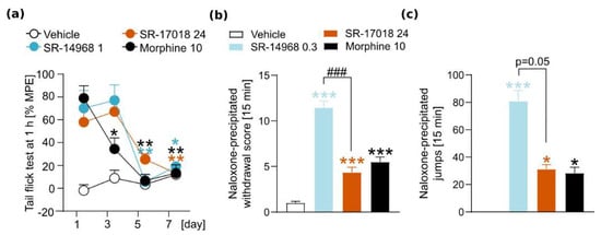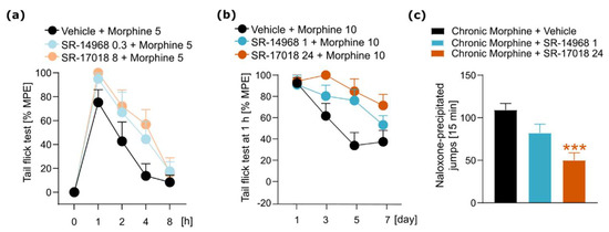 Finally, we aimed to assess the influence of SR agonists on certain behavioral effects of morphine. We tested the impact of SR compounds on morphine-induced antinociception. Moreover, taking into account that SR compounds present prolonged action and, when compared to morphine, tolerance to their antinociceptive effects develops more slowly, we aimed to test their ability to modulate morphine-induced tolerance and physical dependence. SR agonists or vehicle were administered 30 min prior to morphine injection, and antinociceptive responses were measured using the tail flick test. We used the dose of 5 mg/kg of morphine to evoke a moderate antinociceptive effect and the lowest doses of SR compounds, as those agonists had strong antinociceptive action. There is a tendency toward enhanced antinociception in mice cotreated with SR agonists and morphine (treatment effect F(2,24) = 5.17, p = 0.0136); however, the analysis showed no statistically significant interaction effect ((treatment × time) F(8,96) = 0.7646, p = 0.6347, Figure 5a).