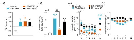 Influence of SR compounds on reward-associated behavior and locomotor activity. (a) SR-14968 (1 mg/kg, i.p.), SR-17018 (24 mg/kg, i.p.) and morphine (10 mg/kg, i.p.) induced a preference towards the drug-associated compartment in a CPP test. (b) An acute treatment with SR-14968 and morphine, but not with SR-17018, caused an enhancement of locomotor activity. (c) Repeated administration of SR-14968 led to the tolerance of locomotor effects, whereas SR-17018- and morphine-treated mice did not present significant changes over a 6-day period of chronic drug treatment. Administration of SR-14968 after the incubation period of 8 days resulted in high expression of locomotor activity on day 14. (d) Body mass changes across the experiment. Data are presented as the mean ± SEM. Significant effects resulting from post hoc analysis are marked on the graphs: in (a,b) effects of treatments compared to a vehicle group are marked with * and differences between SR-agonist-treated groups are marked with #, in (c,d) with * are marked within-group effects compared to the first day of the experiment and expression of locomotor activity (within-group differences between the activity on day 6 and 14). * p < 0.05, **/## p < 0.01, *** p < 0.001. Numbers of animals: (a) vehicle n = 9; morphine n = 8; SR-1468 and SR-17018 n = 10, (b) all groups n = 10, (c,d) vehicle n = 10; morphine n = 10; SR-1468 n = 9; SR-17018 n = 10.