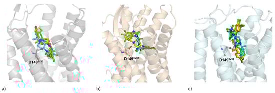 Docking results of PZM-21 (green), (R)-SR-14968 (cyan), (S)-SR-14968 (orange), SR-17018 (yellow) to (a) 4DKL, (b) 5C1M, and (c) 6DDF crystal structures of the µ-opioid receptor. The amino acid numbers presented in superscript follow the GPCRdb numbering scheme [24].