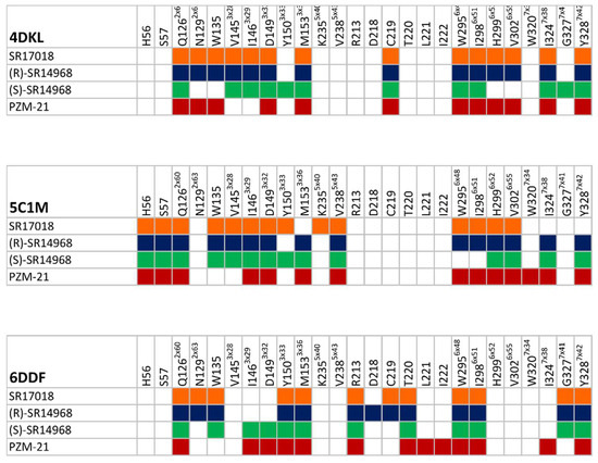In order to indicate amino acids that might be crucial for specific compound effects observed in behavioral studies, a detailed analysis of the frequency of ligand-receptor interactions during MD simulations was carried out. As we were mainly interested in finding discriminants between the SR compounds and PZM21, all data obtained for SR compounds were averaged and compared with the PZM21 interaction patterns. Differences in the frequencies of interactions during MD between SR compounds and PZM21 were determined for each amino acid of the target proteins, and positions with the highest discriminative power are gathered in Figure 9.