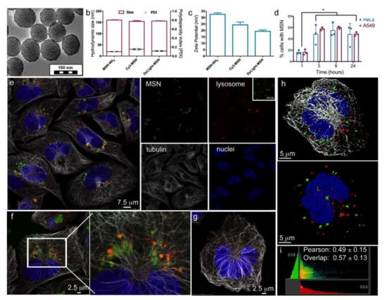 Endolysosomal localization of internalized MSN. (a) Transmission electron micrograph of MSN showing size and porous structure. (b) Dynamic light scattering analysis of hydrodynamic size and polydispersity (in water). (c) Zeta potential measurements before and after fluorophore grafting. (d) Flow cytometry analysis of MSN internalization from 1 to 24 h in HeLa or A549 cells. Merged (e–h) or single (e) fluorophore confocal micrographs of LysoTracker™ Red (red), AF488 anti-α-tubulin antibody (white), and DAPI (blue) labeled HeLa cells following 24 h incubation with DyLight™ 633-labeled MSN (green). The 2D (f) and 3D (g) projection images, with surface rendering in (h). (i) Representative MSN and lysosome colocalization graph and mean Pearson’s correlation coefficient and overlap. * p < 0.05.