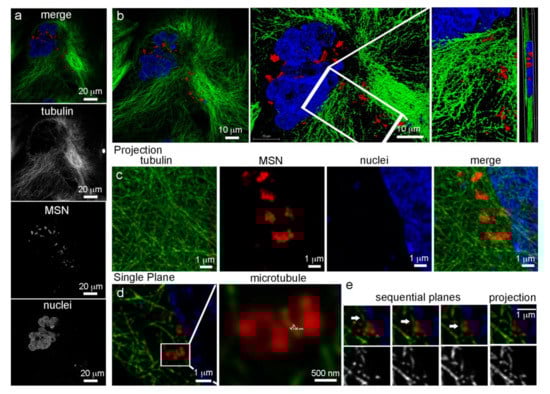 Microtubule highways in HeLa cells. (a,b) Single plane and 3D confocal micrographs showing individual fluorophore and merged images of a HeLa cell incubated with MSN for 24 h [microtubules in green (AF488), nuclei in blue (DAPI), and MSN in red (DyLight 633)]. (c) High magnification single and merged fluorophore projection images showing perinuclear MSN-laden endosomes and their association with microtubules. (d,e) Single plane and projection deconvoluted micrographs showing MSN association with single microtubule filaments. The size bar in “d” shows resolution at 136 nm.