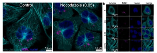 Disruption of MSN-endolysosome trafficking through inhibition of tubulin polymerization. (a,b) Confocal fluorescent micrographs of HeLa cells incubated with DyLight 633 MSN (magenta) in the absence (control) or presence of nocodazole. Cells were post fixation-labeled with AF488 anti-α-tubulin antibody (cyan; microtubules) and DAPI (blue; nuclei). (a) Comparison of control and nocodazole-treated (0.05 µg/mL) HeLa cells. (b) HeLa cells incubated with 0–5 μg/mL nocodazole.