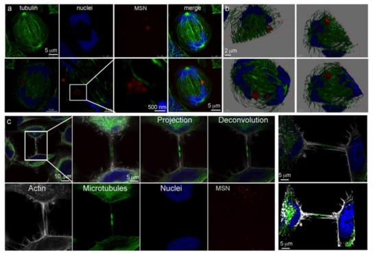 The following figures are available online at https://www.mdpi.com/article/10.3390/pharmaceutics14010056/s1, Figure S1: Mesoporous silica nanoparticle (MSN) characterization, Figure S2: During late telophase-cytokinesis endosomes distribute throughout the nascent daughter cells, Figure S3: Mitotic nanotubes and sizing of mitotic bridges, Figure S4: Topographic imaging of a mitotic bridge and midbody in A549 cells.