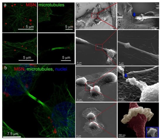 This study examines cellular localization of MSN-laden endosomes at various stages of the cell cycle in order to appreciate the impact of cellular events on nanoparticle destination and dilution, both of which impact the functionality of therapeutic payloads. High-resolution microscopy, combined with electron and correlative microscopy, is used to visualize microtubular networks, both within cell bodies and cellular bridges. Cellular bridges include tunneling nanotubes and mitotic bridges.