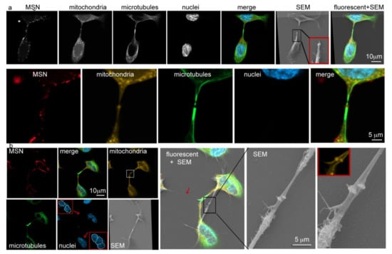 Correlative scanning electron and fluorescent microscopy imaging of a telophase HeLa cell. Merged and single fluorophore confocal and SEM images of two telophase HeLa cells [(a) division; (b) trivision] following 1 h incubation with 10 µg/mL DyLight 550-conjugated MSN (red). Cells were fixed and labeled with AF488 anti-α-tubulin antibody (microtubules; green), MitoTracker Red (mitochondria; yellow) and DAPI (nuclei; blue; red box insets show individual nuclei in (b)). Fluorescent and SEM images were acquired using the Zeiss Airy Scan confocal microscope and the Zeiss Sigma SEM, respectively. Shuttle and Find software was used to overlay the images. The arrow (cyan) indicates the SEM procedural break site in the mitotic bridge.