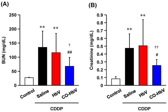 Biochemical analysis of kidney injury. The levels of (A) blood urea nitrogen (BUN) and (B) creatinine at 96 h after each sample treatment in cisplatin (CDDP) mice model. The data represent the mean ± standard deviation (S.D.). Control (n = 8), saline (n = 7), Hemoglobin-vesicle (HbV) (n = 8), carbon monoxide (CO)-loaded HbV (CO-HbV) (n = 8); ** p < 0.01 vs. control, # p < 0.05, ## p < 0.01 vs. Saline, † p < 0.05, †† p < 0.01 vs. HbV.