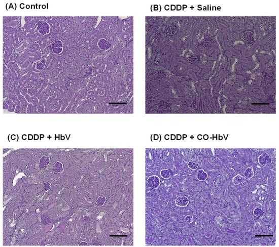Representative imaging of kidney stained by PAS at 96 h after each sample treatment in cisplatin (CDDP) mouse model. (A) Control mice (without CDDP treatment), CDDP mouse model treated with (B) saline, (C) Hemoglobin-vesicle (HbV), and (D) carbon monoxide (CO)-loaded HbV (CO-HbV). Scale bar: 100 µm.