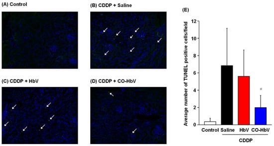 The pathogenesis of CDDP-induced nephrotoxicity is complex and involves several causative elements such as inflammatory cytokines, reactive oxygen species, and mitochondrial dysfunction, followed by the induction of apoptosis [28]. Thus, we next investigated the apoptotic cells in renal tissues of CDDP mouse model by TUNEL assay. The results revealed an increased number of TUNEL-positive cells in the CDDP mouse model treated with saline and HbV compared to control mice (Figure 3A–C,E). In contrast, the number of apoptotic cells was significantly decreased in the CO-HbV-treated CDDP mouse model (Figure 3D,E).