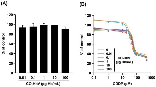 B16-F10 melanoma cells (ATCC® CRL-6475TM) were obtained from Summit Pharmaceuticals International Corporation (Tokyo, Japan). Cells were cultured in Dulbecco’s modified Eagle’s medium (DMEM) supplemented with 5% fetal bovine serum, 100 U/mL penicillin, and 100 µg/mL streptomycin at 37 °C in 5% CO2. B16-F10 melanoma cell suspension (100 µL) was added to each well of 96-well plates at a density of 5 × 104 cells/mL and incubated overnight. After removing the medium, fresh DMEM containing different concentrations of CDDP (100 µL; 0–1000 µM) was added to each well. Fresh DMEM containing CO-HbV (100 µL; 0, 0.02, 0.2, 2, 20, and 200 µg Hb/mL) was then added before incubation for 24 h at 37 °C in a CO2 incubator. Cell viability was determined using cell counting reagent (Nacalai Tesque, Inc., Kyoto, Japan).