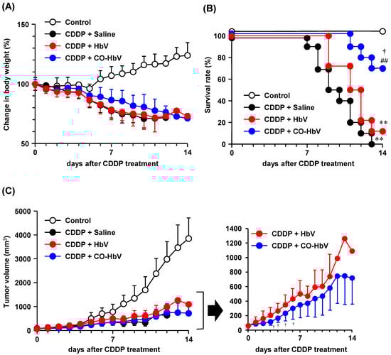 It was also examined whether CO-HbV pretreatment led to the successful anti-tumor activity of CDDP with minimal adverse effects in vivo. In this regard, the bodyweight change and survival rate in B16-F10 melanoma cell-bearing mice during repeated CDDP treatment after CO-HbV pretreatment were evaluated. The bodyweight of B16-F10 melanoma cell-bearing mice was decreased by repeated CDDP treatment (Figure 6A), and all mice died within 13 days (Figure 6B). Similar changes in body weight and survival were observed in B16-F10 melanoma cell-bearing mice pretreated with HbV prior to repeated CDDP administration (Figure 6A,B). On the other hand, CO-HbV pretreatment slightly reduced the body weight loss, and dramatically increased survival in comparison to saline- and HbV-pretreated CDDP mouse models (Figure 6A,B). Since all B16-F10 melanoma cell-bearing mice with no CDDP treatment survived without reduction in body weight during the observation period, the tumor did not cause a reduction in body weight and death. Although the extent of renal injury was not evaluated due to the insufficient number of surviving mice at the endpoint (on day 14), the amelioration of CDDP-induced nephrotoxicity by CO-HbV pretreatment would, in part, result in minimal impact on body weight and survival. Notably, the CDDP mouse model not only induces nephrotoxicity but also results in other adverse effects, such as gastrointestinal toxicity [36], and the protective roles of CO-HbV in such adverse events may contribute to its overall beneficial effects.