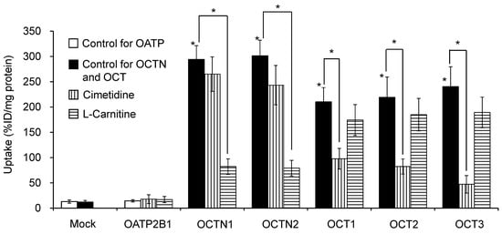 Expression of OATP2B1 was confirmed in HEK293 cells using p-[14C]aminohippuric acid, and expression of OCTN and OCT was confirmed using [3H]methyl-4-phenylpyridinium [,]. One day before the uptake experiments, HEK293 cells expressing the respective SLC transporter were seeded at 4 × 105 cells/well in 12-well plastic plates. Cells of each type were pre-incubated for 10 min in modified Hank’s balanced salt solution (MHBS) and then incubated with [123I]MIBG (37 kBq) for 5 min (n = 4), after which the cells were detached from the tissue culture plate using 0.25% trypsin-EDTA solution (Sigma-Aldrich, St. Luis, MO, USA). The radioactivity associated with the cells was measured using a gamma counter. Cellular protein content was measured using a bicinchoninic acid protein assay kit (Thermo Fisher Scientific Inc., Waltham, MA, USA) with bovine serum albumin as the standard. Uptake of [123I]MIBG by HEK293/OATP2B1, HEK293/OCTN1, HEK293/OCTN2, HEK293/OCT1, HEK293/OCT2, and HEK293/OCT3 cells was compared with uptake by mock control HEK293 cells. The effects of the OCTN and OCT inhibitor cimetidine [,] and OCTN inhibitor L-carnitine [] were assessed by incubating HEK293 cells in a medium containing [123I]MIBG with and without 1 mM cimetidine and L-carnitine in MHBS. Uptake of [123I]MIBG by HEK293/OCTN1, HEK293/OCTN2, HEK293/OCT1, HEK293/OCT2, and HEK293/OCT3 cells was examined using this assay method, with [123I]MIBG uptake shown as % injected dose (%ID)/g protein.