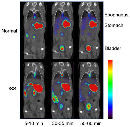 SPECT images of [123I]MIBG in normal and DSS-induced experimental colitis mice at 10, 30, and 60 min after oral administration of [123I]MIBG are shown in Figure 2. A visually notable difference was observed in the bladder between normal and DSS-induced experimental colitis mice. Accumulation of [123I]MIBG increased in the small intestine at 5–10 min and 30–35 min after oral administration.