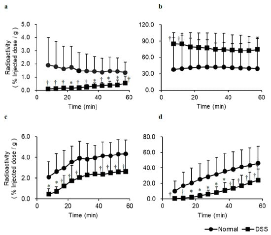 Time activity curves for the heart (a), stomach (b), liver (c), and bladder (d) in SPECT images of control and DSS-induced experimental colitis mice orally injected with [123I]MIBG. In DSS-induced experimental colitis mice, accumulation of [123I]MIBG is significantly lower in the heart, liver, and bladder than in normal mice, whereas accumulation is higher in the stomach in the early time points after oral [123I]MIBG administration. * p < 0.01 and † p < 0.05 between normal and DSS model mice.