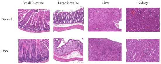 HE staining in conjunction with anti-OCTN1/2 immunohistochemical analysis was performed on tissue from the small intestine, large intestine, liver, and kidney (Figure 4). The DSS-induced experimental colitis mice exhibited lower OCTN1/2 expression (purple dots) than control mice in the small and large intestines. DSS had no notable effects on the liver and kidney.