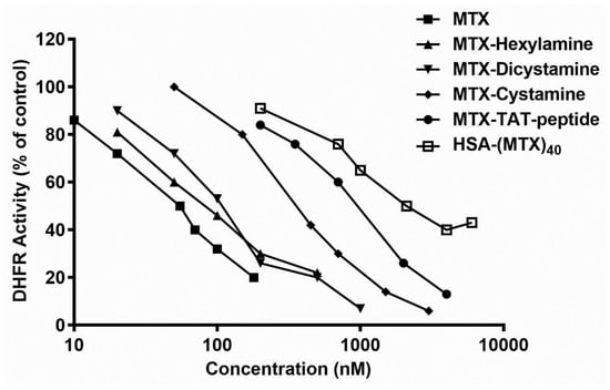 Cancer cell lines were grown in monoculture in 96-well plates in RPMI (CNS-1 cells) or DMEM containing 10% fetal bovine serum, 2 mM l-glutamine, penicillin (100 units/mL), and streptomycin (0.1 mg/mL) under humidified atmosphere containing 5% CO2. Following 24 h or 48 h, MTX or BSA–MTX analogues were added to each plate to give a final MTX or HSA–MTX analogue concentration ranging from 1 nM to 10 µM. Cell viability was measured after 48 h using a standard MTT (3-(4,5-dimethylthiazol-2-yl)-2,5-diphenyltetrazolium bromide) assay, as described before [21].