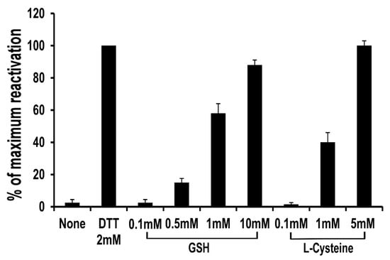 Reactivation of BSA–GSSG–MTX by reduced glutathione and l-cysteine. A solution of BSA–GSSG–MTX (50 μM in 0.1 M HEPES buffer, pH 7.4, 130 mM NaCl) was divided into plastic tubes (1.0 mL/tube) and incubated for 2 h at 25 °C in the absence and the presence of 2 mM DTT and the indicated concentrations of either GSH or l-cysteine. Samples were then analyzed for their DHFR inhibitory potencies and the IC50 values were determined. Results are expressed as percent of maximal reactivation (obtained by preincubation with 2 mM DTT). Each point is the arithmetic mean of n = 4 tubes ± SEM.