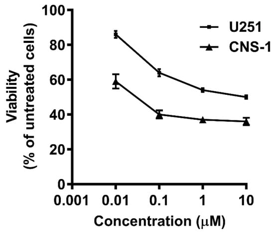 Viability of CNS-1 and U251 towards MTX. CNS-1 and U251 glioma cells were seeded in 96-well plates and MTX was applied a day later at the indicated concentrations. MTT assay was performed after 48 h. Viability is presented as mean ± SEM of each group in comparison to untreated cells. n ≥ 20 from at least six different experiments. There is a significant difference of p < 0.01 between the two cell lines in all concentrations measured.