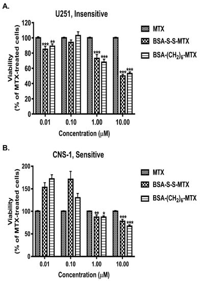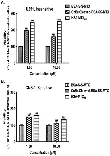 Of equal interest was to determine the efficacy of those glioma cell lines to regenerate the antiproliferative potencies of albumin–MTX analogues which lost their native three-dimensional configurations (Figure 5A,B).