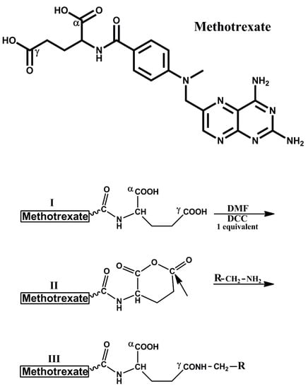- Cooper, I.; Fridkin, M.; Shechter, Y. Conjugation of Methotrexate-Amino Derivatives to Macromolecules through Carboxylate Moieties Is Superior over Conventional Linkage to Amino Residues: Chemical, Cell-Free and In Vitro Characterizations. PLoS ONE 2016, 11, e0158352. [Google Scholar] [CrossRef][Green Version]