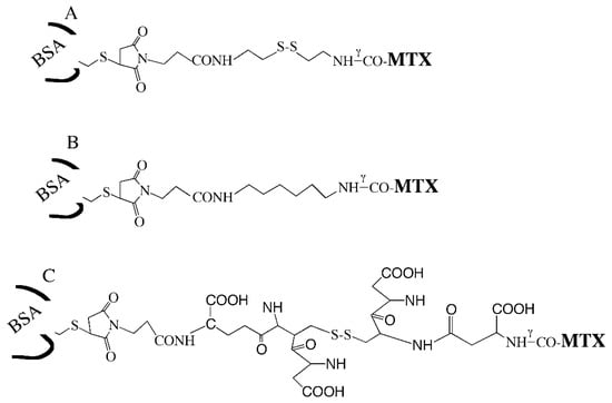 BSA–S–S–MTX | BSA–S–MAL–(CH2)3–CONH–(CH2)2–S–S–(CH2)2–NHγCO–MTX |