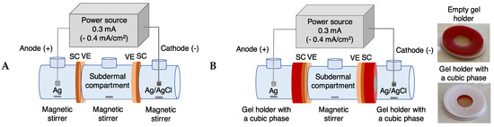 Graphical representation of the reverse iontophoresis experiments with anodal and cathodal receptor phases comprising either (A) an aqueous buffer (n = 5–12, see Table 2), or (B) a cubic phase in contact with an aqueous buffer (n = 3–5, see Table S7 in Supplementary Materials).