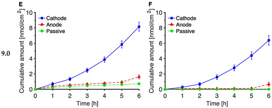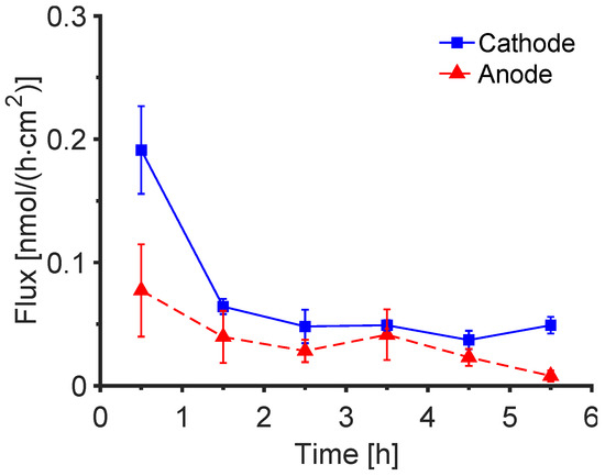 The deduced flux profiles from Figure 2 (panels C and D) are shown in the corresponding panels of Figure S7 in the Supplementary Materials (a summary of the data is also in Figure S8 and Table S2). The cathodal fluxes increased steadily over the 6 h of extraction (by which time the Trp and Kyn fluxes were 2.0 (± 0.2) and 1.9 (± 0.2) nmol/cm2/h, respectively) while that of Trp to the anode appeared to reach a relatively constant, but an order of magnitude lower, level of about 0.2 nmol/cm2/h. The passive fluxes of both compounds and the anodal flux of Kyn were even smaller and sometimes unquantifiable.