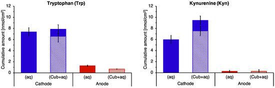 The cumulative reverse iontophoretic extraction of Trp and Kyn into semi-solid GMO cubic phase matrix in 6 h is shown in Figure 5 and compared with the results reported earlier when an aqueous, pH 7.4 buffer was used as the receiver medium; the data are also summarised in Table S7 in the Supplementary Materials. Successful and comparably efficient extraction into the cubic phase was achieved with, once more, significantly preferential electrotransport of the analytes to the cathode. The results show that Trp and Kyn were drawn into and eventually through the semi-solid matrix in the course of the extraction process.