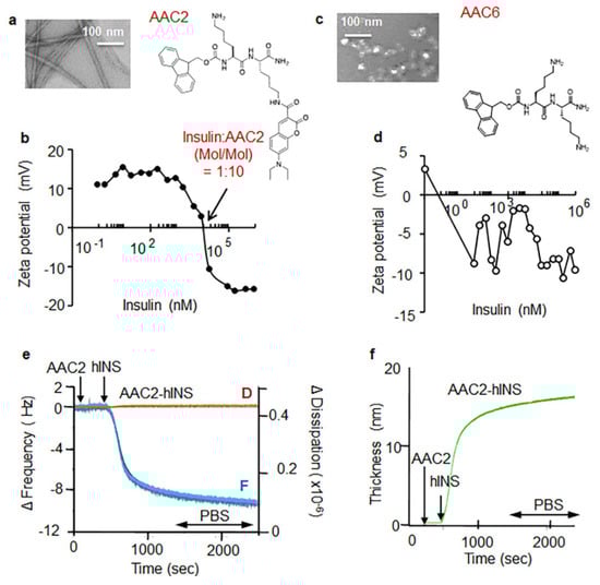 Next, we analyzed whether the electrostatic binding of hINS to the surface of the AAC2 nanofibers produced a stable complex. The kinetics of the formation of AAC2 complex with hINS was assessed using quartz crystal microbalance experiments. In response to a generated acoustic wave, changes in the frequency (ΔF) are directly proportional to the added mass and thickness while changes in the dissipation energy (ΔD) contain information about the viscoelastic properties of the film []. The changes in frequency and dissipation in response to.AAC2 indicated the formation of a stable film (Figure 1e), which bound insulin to form a 15 nm film on the active gold surface at physiological conditions (Figure 1f). This film was stable after a PBS wash, suggesting that insulin was not released from the nanofibers (Figure 1e,f) and thus formed a stable complex.