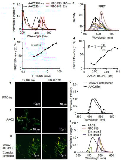 Fluorescence resonance energy transfer (FRET) between interacting AAC2 and Fluorescein (FITC)-labeled INS (FITC-INS). (a) Normalized UV-vis absorbance and fluorescence excited (Ex) at 402 nm intensity of AAC2 (1 mM) and FITC-INS (57.3 μM for UV-vis and 28.65 μM for fluorescence Ex 487 nm) in PBS to show the spectral overlap. (b) Fluorescence spectra of the 1:0.67 AAC2:FITC-labeled insulin mixtures were diluted serially in PBS. (c) The percentage of FRET efficiency of each mixture was calculated based on (b) using the emission at 479 nm of the mixtures and pure AAC2. (d) The percentage of FRET efficiency was calculated based on the emission at 479 nm of fluorescence spectra (Ex 405 nm) of mixtures of 0.1 mM AAC2 with varying concentrations of FITC-labeled insulin to obtain different molar ratios, with a constant concentration of AAC2. Mixtures were incubated at room temperature for 30 min prior to measurement. (e,f,h) Confocal images and emission spectra of (g,i) of 0.1 mM FITC-INS (e), 1 mM AAC2, (f,g) and (h,i) 10:1 AAC2:FITC-INS (containing 1 mM AAC2) was incubated at room temperature for 30 min prior to imaging. Each sample was excited at both 402 nm (first column) and 487 nm (second column). The emission data were co-plotted with normalized emission, comparing AAC2 and FITC-INS. The dashed line indicates the emission of area 1 in the confocal image.