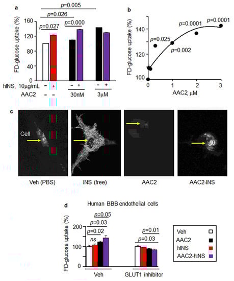 Human brain endothelial cells (hBEC, CRL-3245, ATCC) were cultured in DMEM:F12 (30-2006, ATCC) supplemented with 10% FBS (10082, Gibco, Gaithersburg, MD) and endothelial cell growth supplement (component of CCM027, R&D systems, Minneapolis, MN). The hBEC (2 × 104/0.1 mL/well) were cultured in a 96-well plate coated with 0.1% gelatin solution (Sigma-Aldrich, ES-006-B) for 24 h prior to glucose uptake measurement. Cells washed with PBS, were treated with vehicle (Veh; PBS) or hINS (1.7 µM) or AAC2 (0.1 µM) or AAC2-hINS which were diluted in same glucose free DMEM (Gibco, A14430, 200 µL/well) for 40 min. Then, GLUT1 inhibitor (BAY-876; 10 nM diluted in DMSO; Selleckchem, Houston, TX, S8452) or DMSO were added in 100 µL of FD-working solution per well and incubated for 50 min at 37 °C.