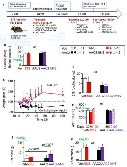 Improved body composition in AAC2-hINS-treated mice with STZ-induced T1D. (a) Schematic presentation of induction of experimental T1D by streptozotocin (STZ mice, total n = 44 mice) and treatment protocol of control group with vehicle, AAC2, hINS, AAC2-hINS complex. Treatments were administered intraperitoneally (i.p.) every 3 days. After starting treatments, mice died or were sacrificed prior to the death (30 days group). The surviving mice continued with treatments for 100 days. (b) Glucose levels (mM) in STZ-induced mice groups prior to the treatment. One-way ANOVA. p = 0.157; not significant, ns. Green dashed line-the fasting glucose levels in healthy mice. (c) Weight gain of the STZ mice was measured until they succumbed to the diseased (n = 7) or were sacrificed. Data are shown as % of baseline body weight of each animal before induction of T1D (100%, gray dash line). Overall comparison p = 0.001 (Kruskal–Wallis test with a Mann–Whitney U-test for post hoc testing). For (d) Food intake was collected for 24 h on multiple days. (e) Plasma aspartate aminotransferase (AST) levels in plasma of the STZ mice were measured after 30 days and 100 days post treatment. One-way ANOVA. ns, not significant. Green dashed line-the AST levels in healthy mice (n = 6). (f,g) Fat (f) and lean (g) body mass of the STZ mice and healthy mice (dashed line, n = 6) were measured using Echo-MRI 3 weeks after. p = 0.043 for overall comparison of fat body mass. ns, ANOVA.