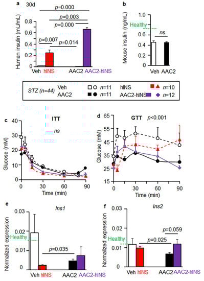 AAC2-hINS treatment vs. free hINS increased levels of circulating therapeutic hINS and expression of endogenous insulin in the brain. (a) The plasma levels of therapeutic hINS were measured three days after the last treatment (30 d). For overall comparison, a Kruskal–Wallis test with a Mann–Whitney U-test for post hoc testing, p = 0.001. (b) The plasma levels of endogenous mouse insulin mice were measured in the same samples. n.s.—Student’s independent t-test. (c) Insulin tolerance test (ITT) in the STZ mice was performed one day after treatment administration. One-way ANOVA. ns. (d) Glucose tolerance test (GTT) in STZ mice. Overall comparison, p = 0.001. (e,f) Expression levels of mouse Ins1 (e) or Ins2 (f) in the STZ mouse brain tissues were measured by a Taqman Mann–Whitney U test. Dashed line, levels in healthy mice (n = 6).