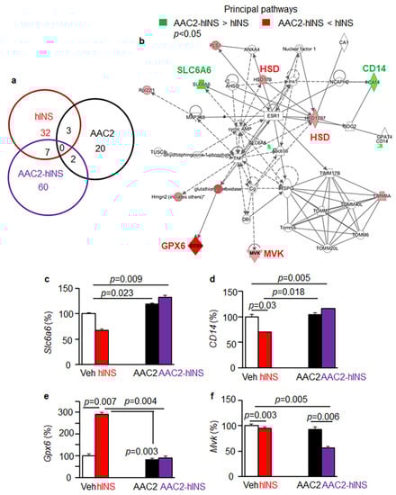 AAC2-hINS treatment regulated a distinct set of genes compared to its free constituents. (a) Comparison of unique and overlapping the expression of hepatic genes, that were significantly different from the control (Veh, not shown, n = 3, cut off were ≥1.5 fold difference and p < 0.01) across STZ mice treated with AAC2 (black), hINS (red), and AAC2-hINS (purple), (n = 3/group). Gene expression was analyzed by Affymetrix GeneChip. (b) Ingenuity pathway analysis was performed based on the statistically different genes predicted metabolic hubs that were distinctly regulated in response to hINS vs. AAC2-hINS treatments. Green shapes indicate higher expression in AAC2-hINS vs. hINS groups, such as Slc6a6 (c) and CD14 (d). Red shapes show the higher expression of genes in IPA analysis in mice treated with free hINS vs. AAC2-hINS, such as Gpx6 (e) and Mvk (f).