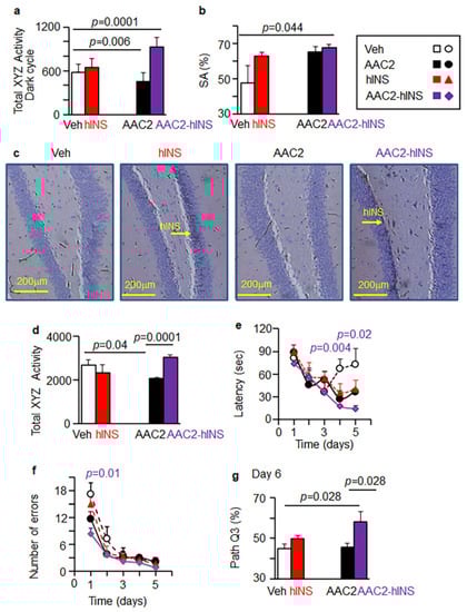 Given that STZ can alter sensory perception [], which can influence the results of the Y Maze test, we validated the locomotor and cognitive efficacy of AAC2-hINS vs. free AAC2 and hINS in a genetic Ins2Akita mouse model of T1D (Figure 7d–g).
