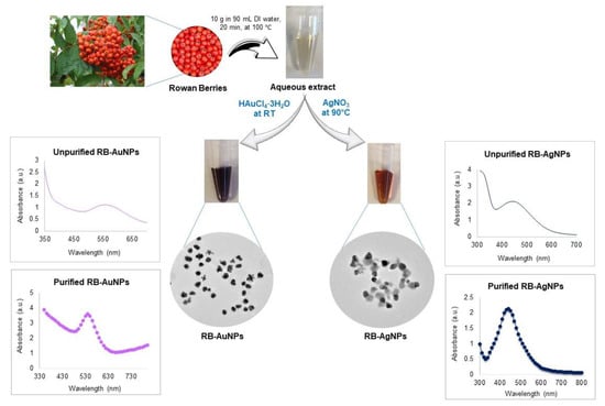 Schematic representation and UV-Vis spectra of RB-AuNPs and RB-AgNPs formation form an aqueous extract of rowanberries.