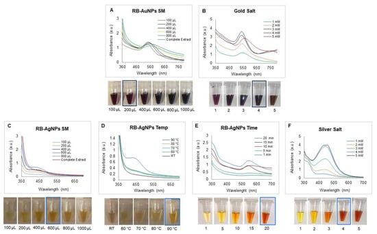 The optimization studies for RB-AuNPs and RB-AgNPs were also conducted by using UV-Vis spectrum analysis and visible observations []. For RB-AuNPs, the optimum ratio of SM was 2:8 (Figure 2A), gold salt concentration was 4 mM (Figure 2B), and the reaction took place at room temperature within 5 s. The synthesis was so quick that the rowanberries extract showed complete color change at RT as soon as gold salt was added. For RB-AgNPs, the optimized ratio of SM for nanoparticles production was 6:4 (Figure 2C), temperature 90 °C (Figure 2D), synthesis time 20 min (Figure 2E), and at 4 mM silver salt concentration (Figure 2F).