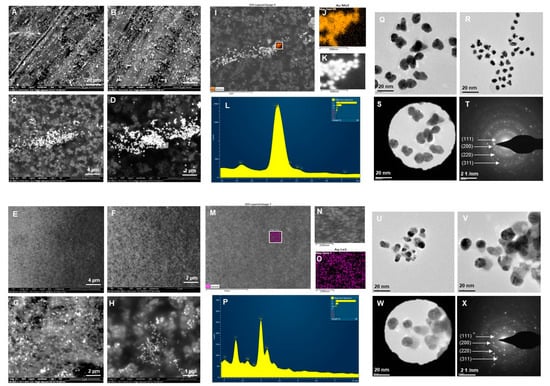Structural analysis of RB-AuNPs and RB-AgNPs. For RB-AuNPs, (A–D) SEM images of nanoparticles at different scales, (I–K) Elemental mapping of RB-AuNPs showing scanned image of NPs with gold element distribution (orange), (L) EDX spectrum of the elemental mapped region showing sharp peak for gold element. (Q,R) TEM image of RB-AuNPs, (S,T) SAED pattern. For RB-AgNPs, (E–H) SEM images of nanoparticles at different scales, (M–O) Elemental mapping of RB-AgNPs showing scanned image of NPs with silver element distribution (pink), (P) EDX spectrum of the elemental mapped region showing highest peak for silver element. (U,V) TEM image of RB-AgNPs, (W,X) SAED pattern.