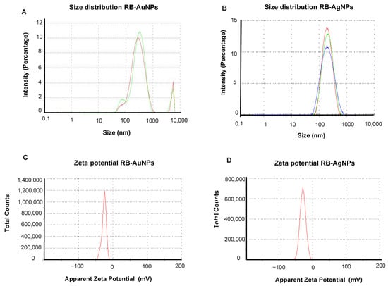 Dynamic light scattering analysis of RB-AuNPs and RB-AgNPs. (A) RB-AuNPs distribution concerning size and intensity (B) RB-AgNPs distribution concerning size and intensity. Different color represents technical replicates. (C) Zeta potential of RB-AuNPs and (D) RB-AgNPs, representing highly negative surface charge.